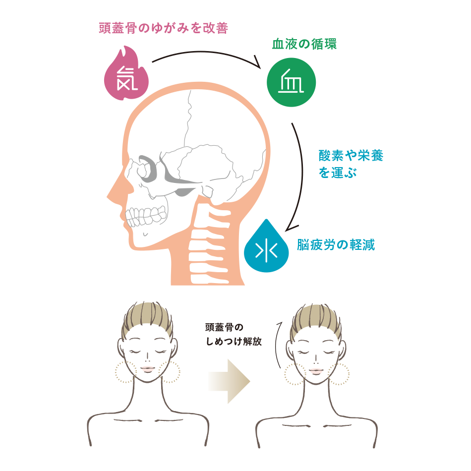 私たちの頭蓋骨は15種類、23個の骨から構成されており、お母さんの産道を通って生まれてくる時に頭が圧迫されて変形する歪みを吸収する役割を果たすため、骨の間には隙間があります。これが成長するなかで骨がしっかりと結合されていきます。しかし私たちは日常生活でストレスを感じたり、疲れた時にこの隙間がなくなることで脳が圧迫され不調を引き起こしてしまいます。