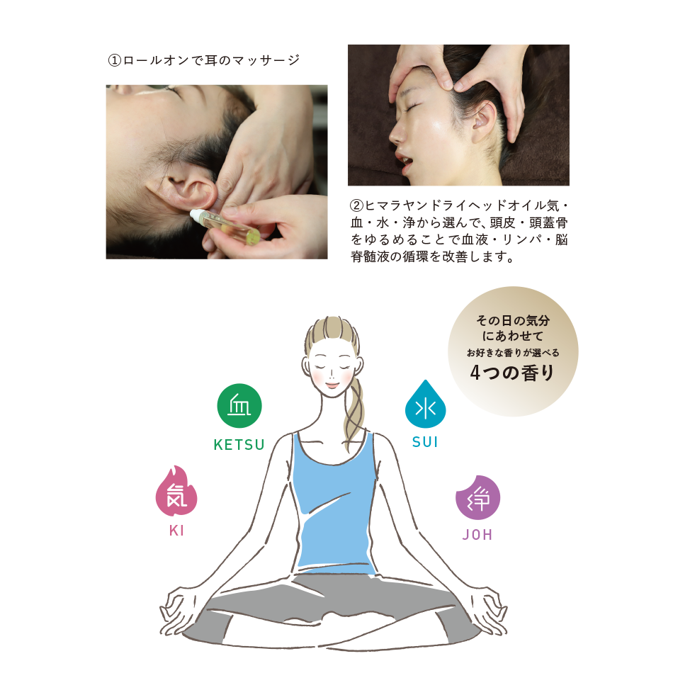 世界で最もパワーがあるとされているヒマラヤ山脈の厳しい環境を生き抜く高山植物から、特殊製法で抽出したオイルを1000年以上の歴史ある秘伝レシピで生薬として調合した「ヒマラヤンオイル」。東洋医学の考えである気・血・水の現代人の日常の不調や悩みにアプローチするヘッドマッサージ技術です。