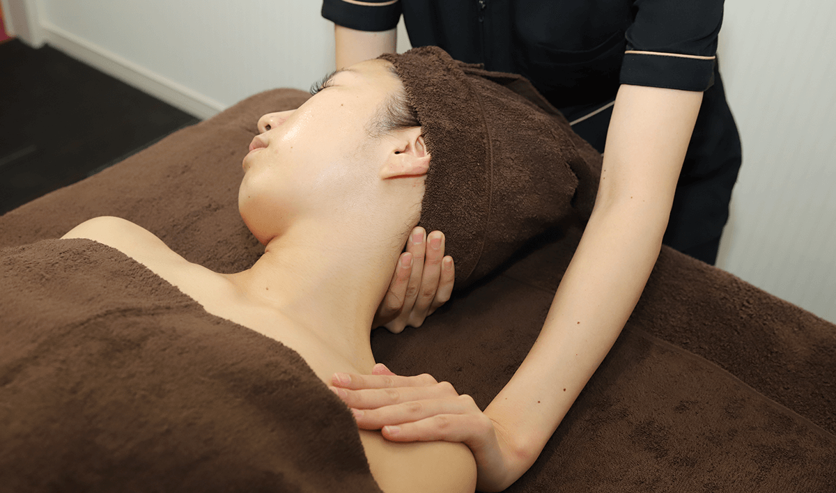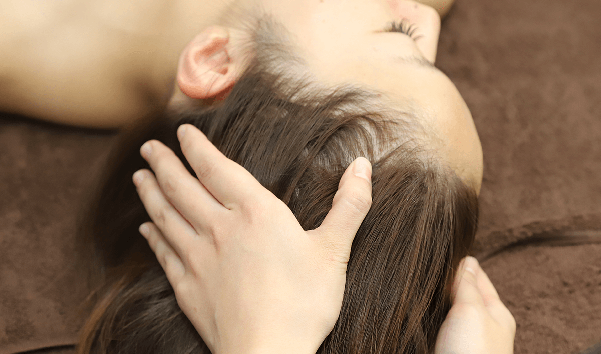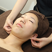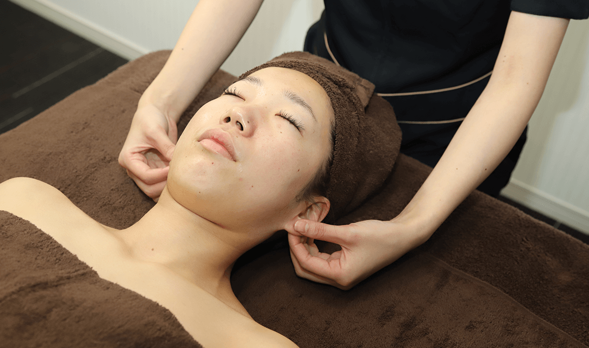 耳や頭皮を専用オイルでほぐし血行やリンパを流す。